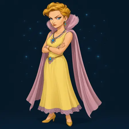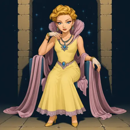 1소녀, 단독, 금발, 단발, 파란 눈, 보석, 귀걸이, 목걸이, 팔찌, 손가락 없는 장갑, 스카프, 노란 드레스, 하이힐