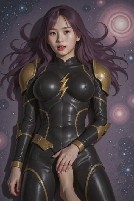 Ultra-realistic photo of a asian female. she has gape-violet hair, heroic female black adam suit in glossy black, and yellow lightning heavy exo-armor. Lightning symbol in the center of the chest.