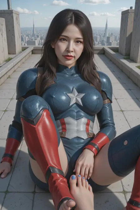Ultra-realistic photo of a asian female. She has silver hair, heroic female captain marvel suit in glossy red, blue, and golden heavy exo-armor. Star symbol in the center of the chest.