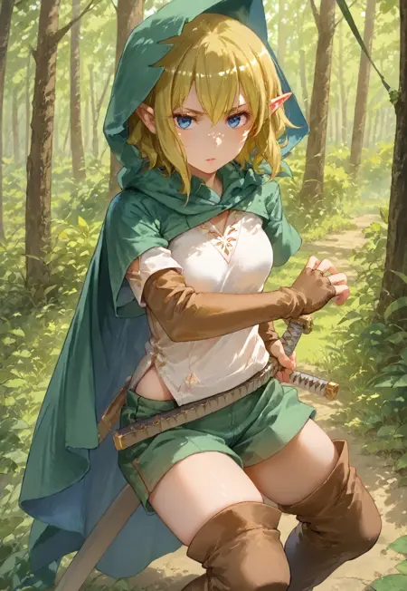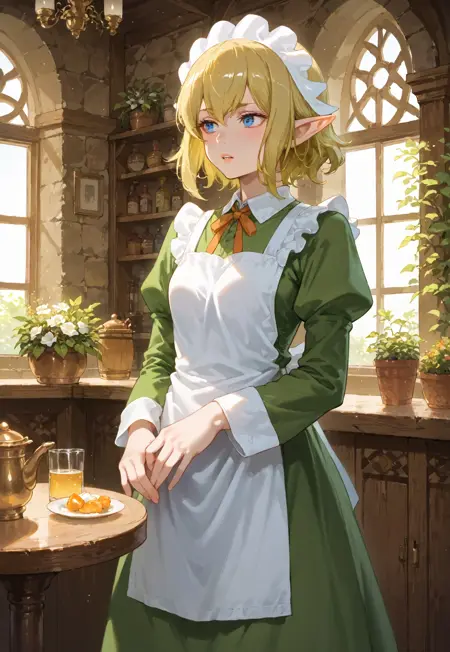 Trigger: 1girl, elf, pointy ear, blonde hair, blue eyes,