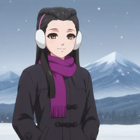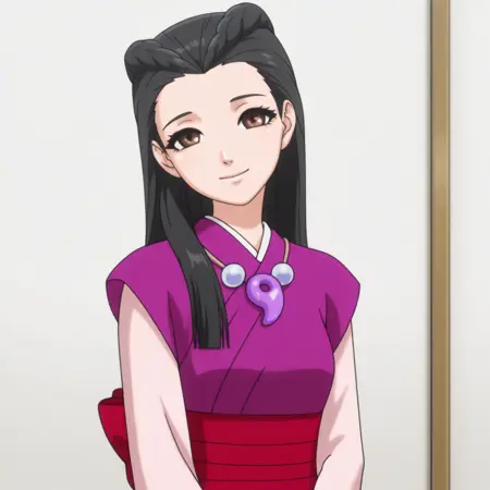 衣装タグ:紫の着物、長袖、ピンクの袖、勾玉のネックレス、赤い帯、指なし手袋