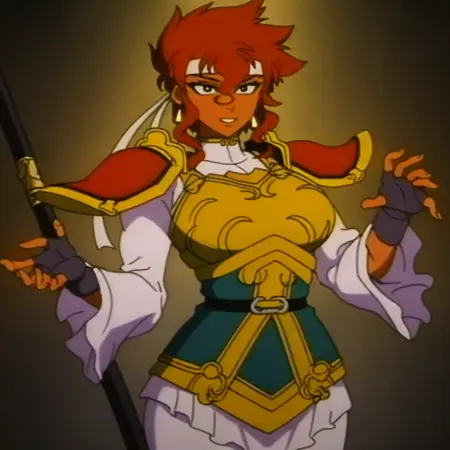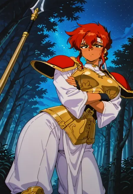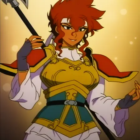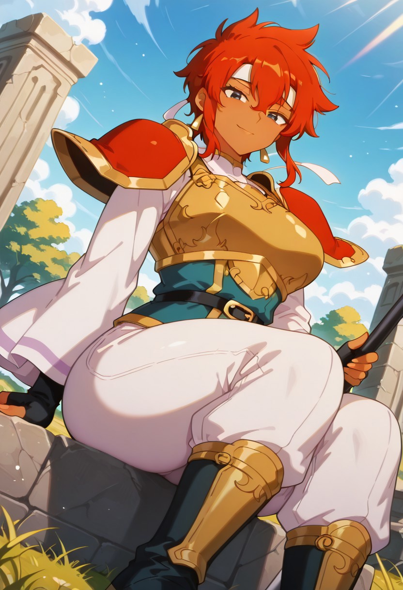RouhaGSGR, 1个女孩, 单人, 晒黑的皮肤, 红发, 中长发, 发丝遮住眼睛, 刘海, 白色发带, 侧发, 大眼睛, 黑色眼睛, 金色耳环, 红色肩甲, 金色铠甲, 胸甲, 大胸部, 白色袖子, 宽袖, 白色裤子, 宽裤, 厚大腿, 靴子, 露指手套, 长柄武器, 腰带,