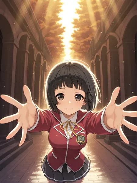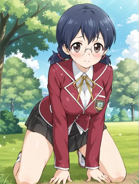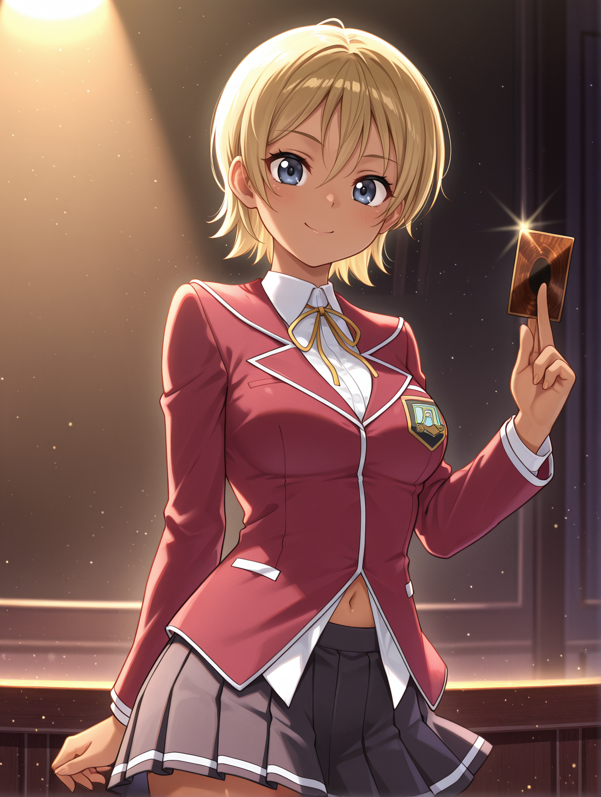 태그 (의상 - 1): 듀얼 아카데미 유니폼 (Yu-Gi-Oh! 5D's), 노란 목 리본, 빨간 블레이저, 흰색 칼라 셔츠, 검은 미니스커트,