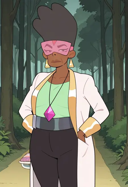 基础提示词: Dr. Lullah,年长,高个子,深色皮肤女性,灰发,水晶项链,粉色调眼镜,