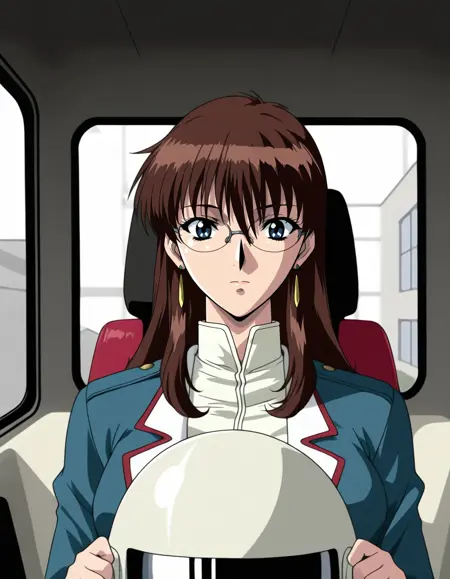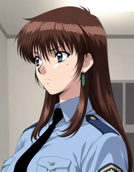 mai-morikawa-yukari,retro_artstyle,1990s_(style),aged_up,mature_female,long_hair,brown_hair,large_breasts,green_earrings,suit,cleavage_cutout,black_skirt,pantyhose,high_heels,red_footwear,handgun
