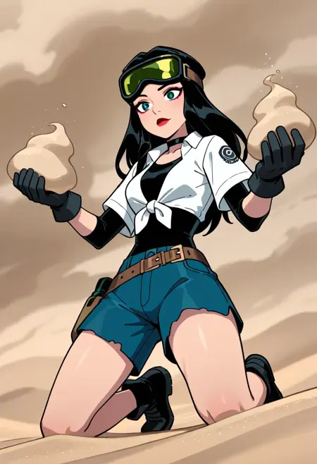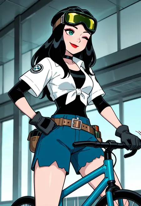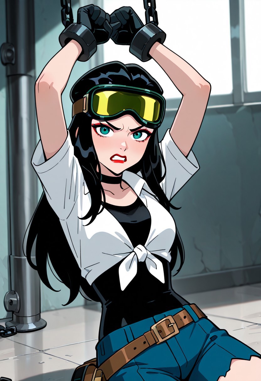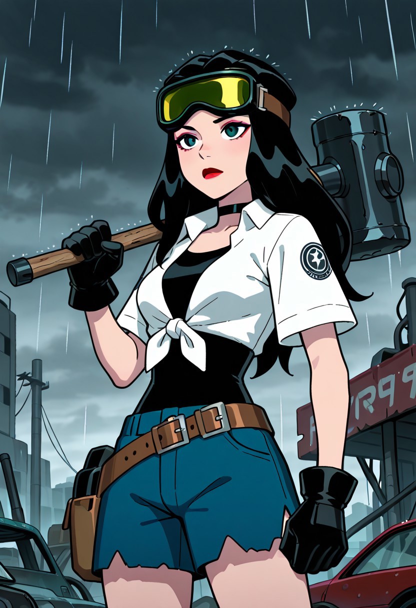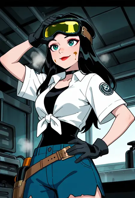 1girl, long hair, black hair, white shirt, makeup, lipstick, goggles on head, tied shirt, short sleeves, blue shorts, brown belt, black gloves, black undershirt