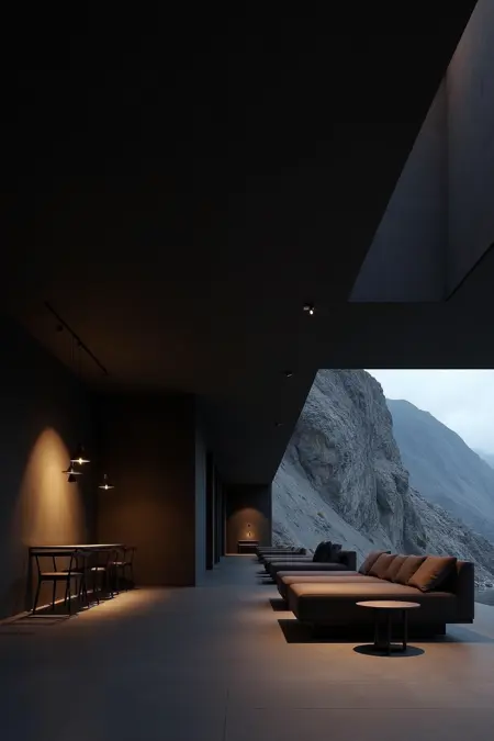 4. 기하학적 구조를 가진 다크 톤 인테리어, 모듈식 좌석, 간접 조명, 산맥 풍경 통합, 매트 마감, 유동적인 공간 라인.