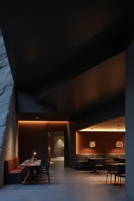 幾何学的構造を持つダークトーンの内装、ライン状のペンダントライト、低めのテーブル、天然石の壁、コントラストのオレンジパネル、広いネガティブスペース。