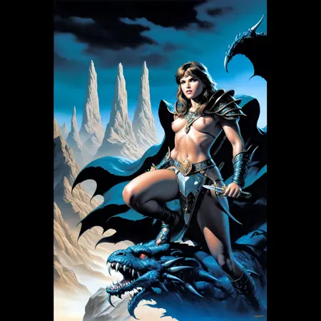 sdxl, illustrious, fantasy, high fantasy, pulp, dnd, 80s fantasy, sword and sorcery, bikini armor, hand-painted, vintage, dramatic shading, heavy contrast, warrior woman, barbarian, sorceress, dragon