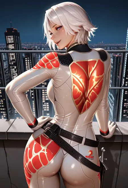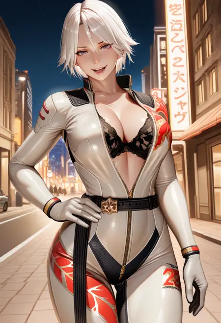 "BODCHR, white hair, short hair,purple eyes, white bodysuit, unzipped, black bra, red print, cod piece, white gloves, loose belt"