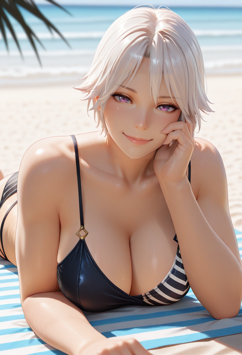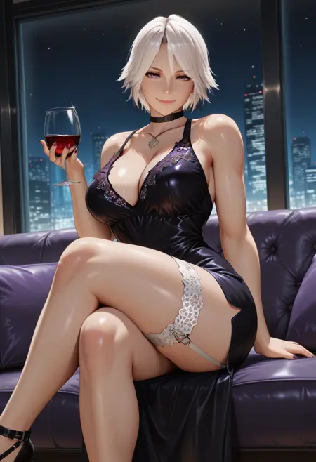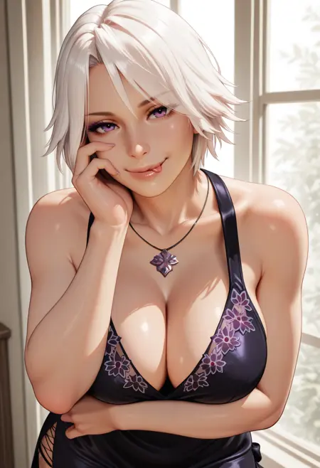 "DRECHR1, white hair, short hair, purple eyes, black dress, purple embroidery,white laced thigh strap, necklace"