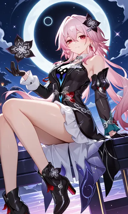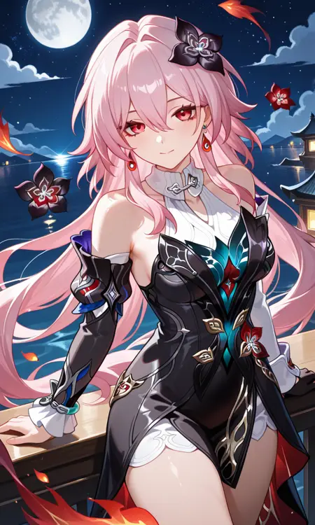 エバーナイトHSR、1人女の子、ピンク髪、目の間に髪、髪飾り、髪の花、黒い花、赤い目、長い髪、非常に長い髪、胸、中程度の胸、太もも
