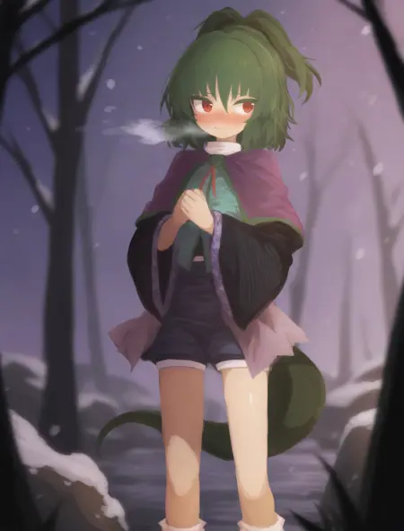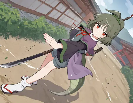 adagumo no saragimaru、蛇の髪飾り、紫のキャップレット、緑のトリム、ショーツ、アクア色のベスト、赤いネックリボン、広い袖、白い靴下、リボン付き靴下、草履、蛇の尾、