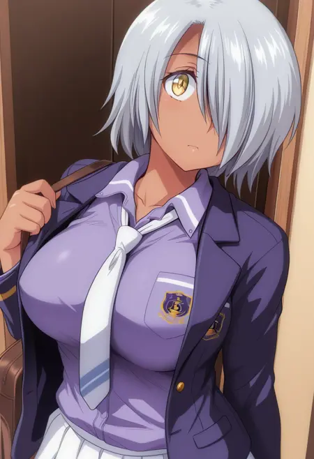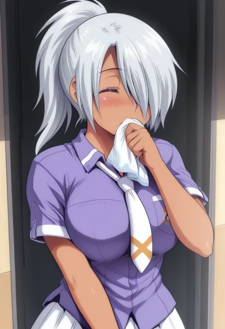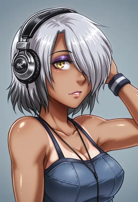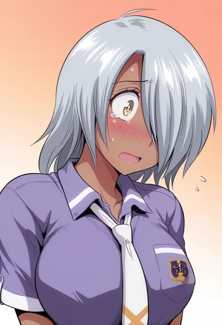 trigger words: shirogane sakura, 1girl, dark-skinned female, hair over one eye, grey hair, white hair, short hair, yellow eyes,