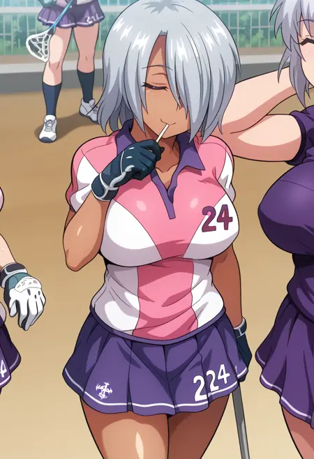 lacrosse outfit: sakuralacu-sportswear, sakuralacu-shirt, pleated skirt, purple skirt, joshilacu-gloves, joshilacu-lacrosse-stick,