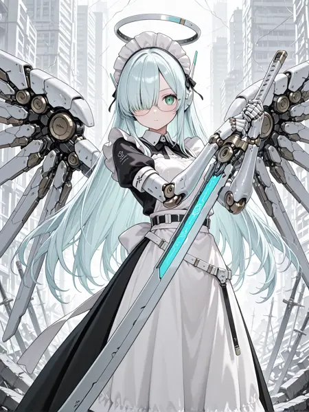1girl,shirakawa tokine,light blue hair,long hair,hair over one eyes,green eyes,glasses,robot ears,medium breast,silver mechanical,mechanical arms,mechanical legs,mechanical wings,mechanical halo,mechanical joints,slender body,