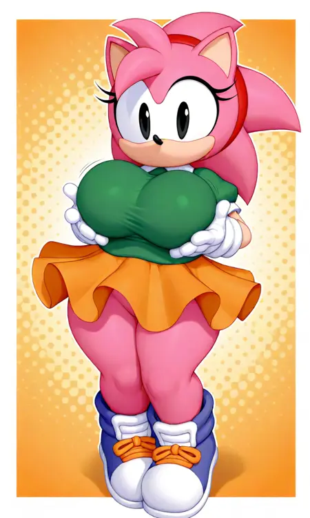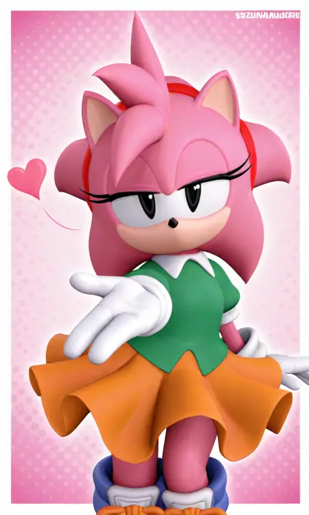 태그: OM_amy, 호그, 분홍색 날카로운 머리카락, 분홍색 털, 복숭아색 코, 검은 눈, 빨간 헤드밴드, 녹색 풍성한 소매 셔츠, 흰색 칼라, 주황색 치마, 흰장갑, 파란 신발, 주황색 끈, 작은 체형, 입 없음
