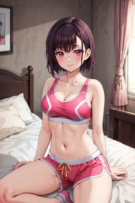 mikazuki shizuka,pink eyes,short hair,bangs,hairclip,hair ornament,medium breasts,hooded jacket,long sleeves,sports bra,pink shorts,leggings,sneakers