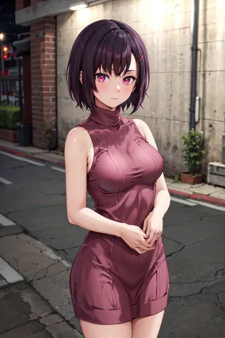 三日月しずか、ピンクの目、短い髪、前髪、ヘアクリップ、中くらいの胸、フード付きジャケット、長袖、スポーツブラ、ピンクのショートパンツ、レギンス、スニーカー