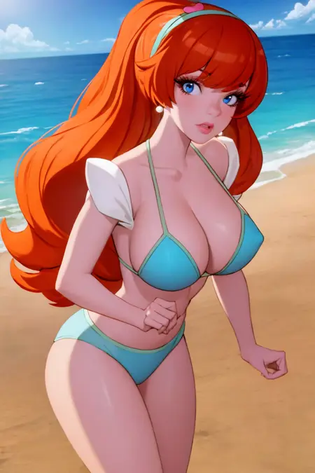 基本プロンプト:1girl, kimberly, long hair, orange hair, blue eyes, hairband, earrings, makeup, nose
