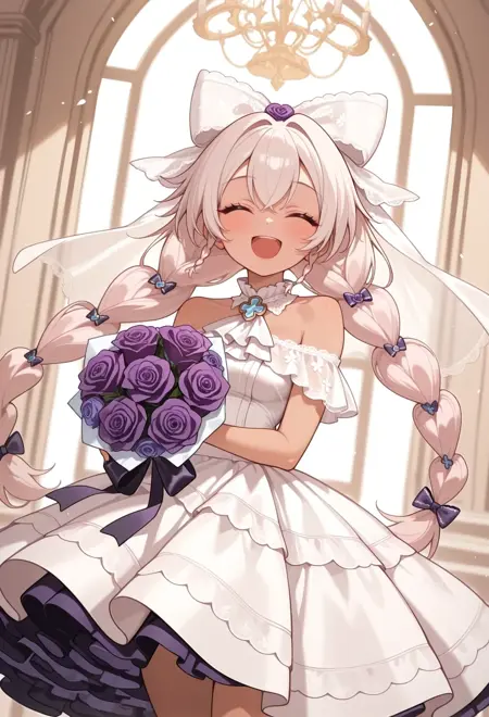 low twin braids,white dress,frills,lace-trimmed dress,bare shoulder,purple petticoat,hair bow,lace bow,purple rose,flower braid,white ascot,