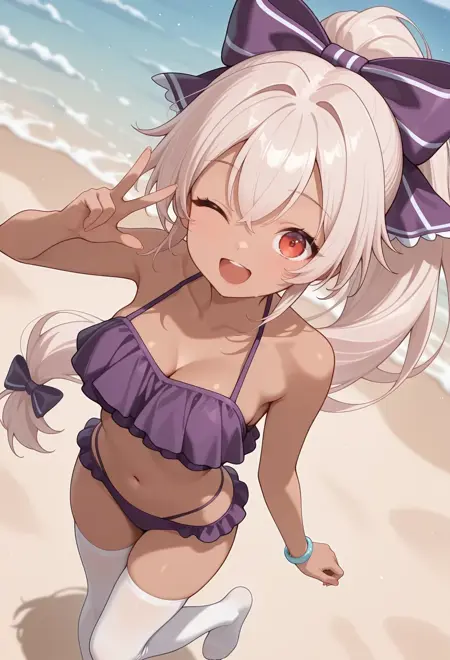 red bikini,frilled bikini,ponytail,hair flower,thigh strap,