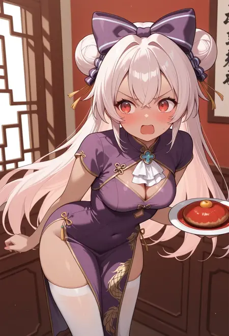 china dress,purple dress,hair bow,double bun,white thighhighs,cleavage cutout,