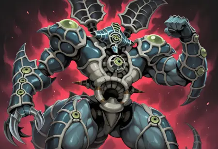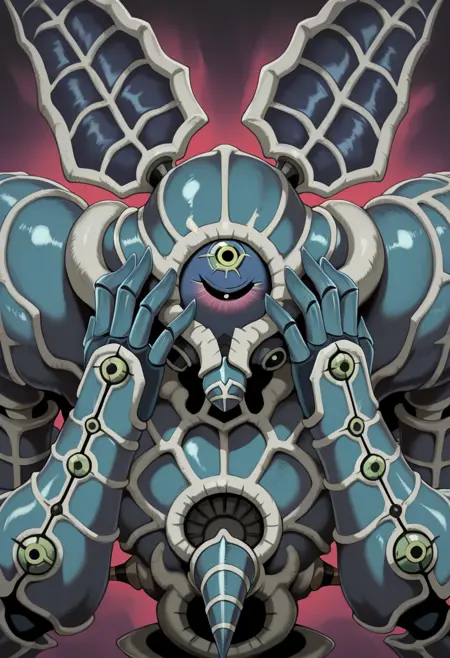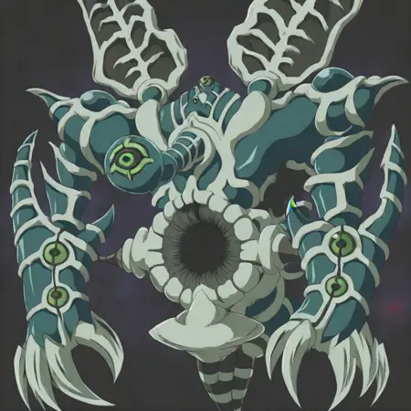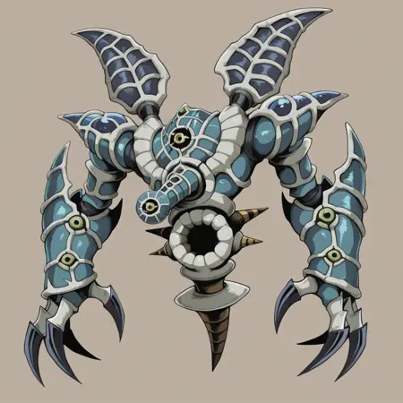 yugioh、青い体、骨の鎧、骨の翼、単眼、爪、独特な下部体、腹部の穴、デュエルモンスター、モンスター、バイオメカニカル