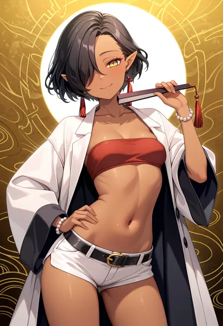 | トレーニングワード | KJOluca, black hair, yellow eyes, pointy ears, hair over one eye, dark skin female, short hair,コピーしました! brown choker, dark blue short puffy sleeves, white thighhighs, brown fingerless gloves, midriff, halterneck leotard, white thong, white revealing clothes, dark blue garter straps,コピーしました! |