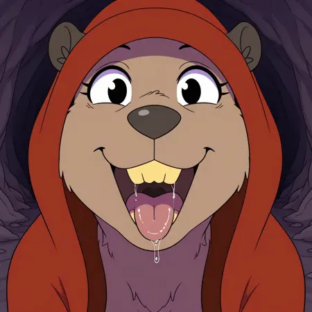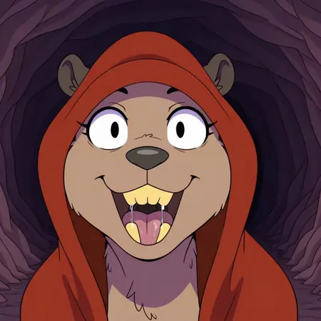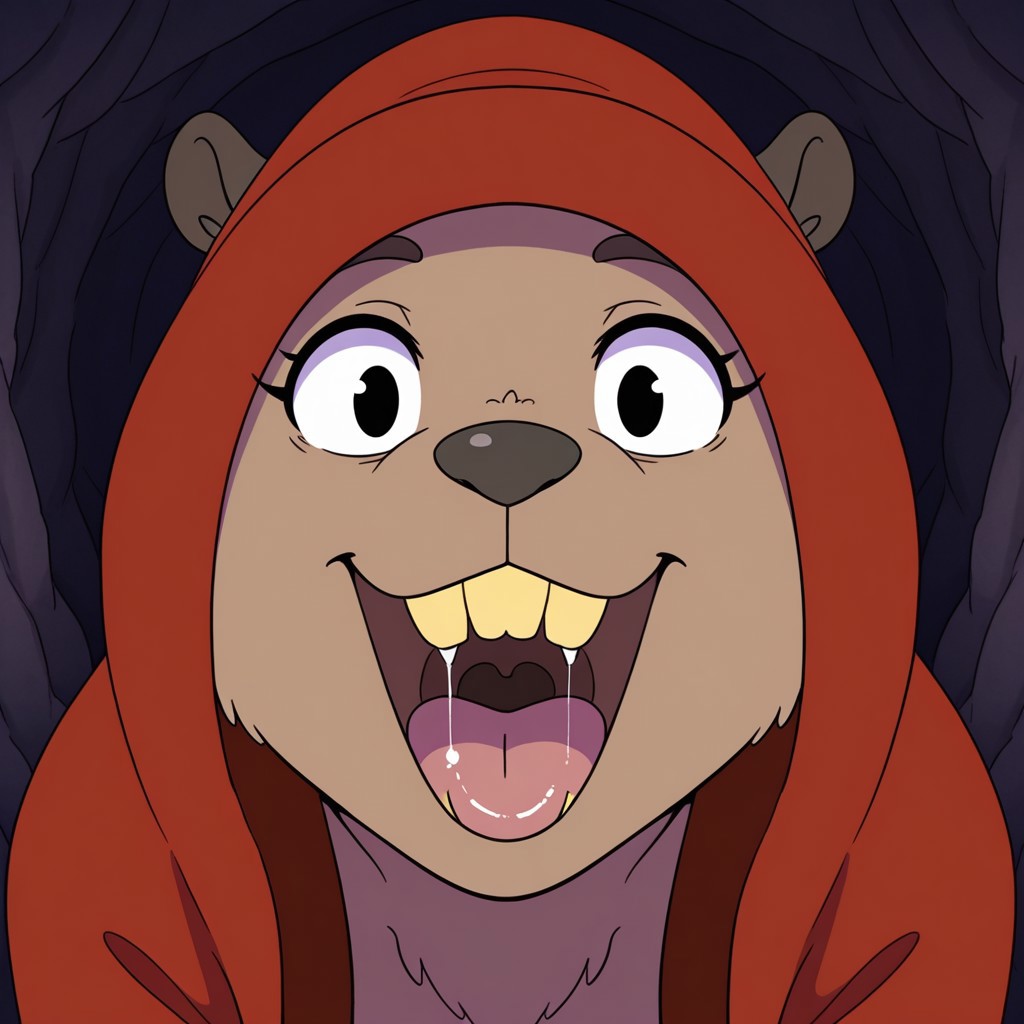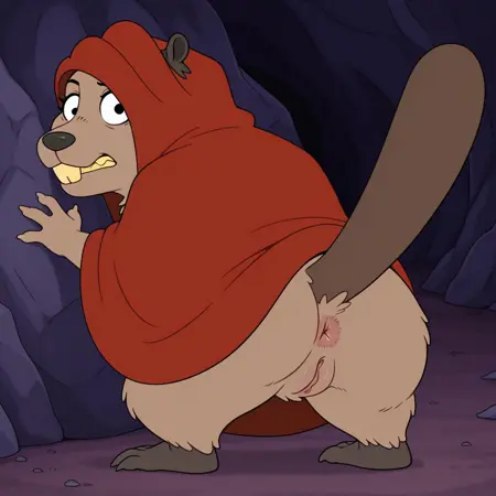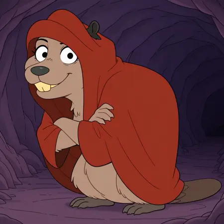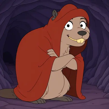 rodent, beaver, brown fur, black eyes, black nose, buckteeth, yellow teeth, black ears, black feet, beaver tail, red cloak, hunched over,