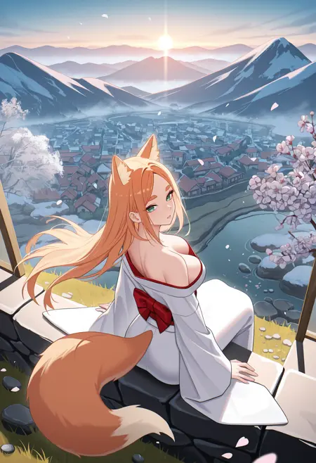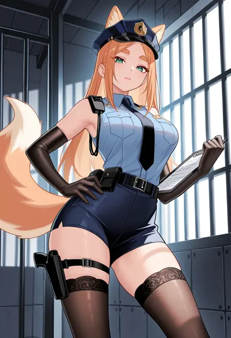 KJOfran, orange hair, parted bangs, long hair, animal ears, thick eyebrows, green eyes, tail,