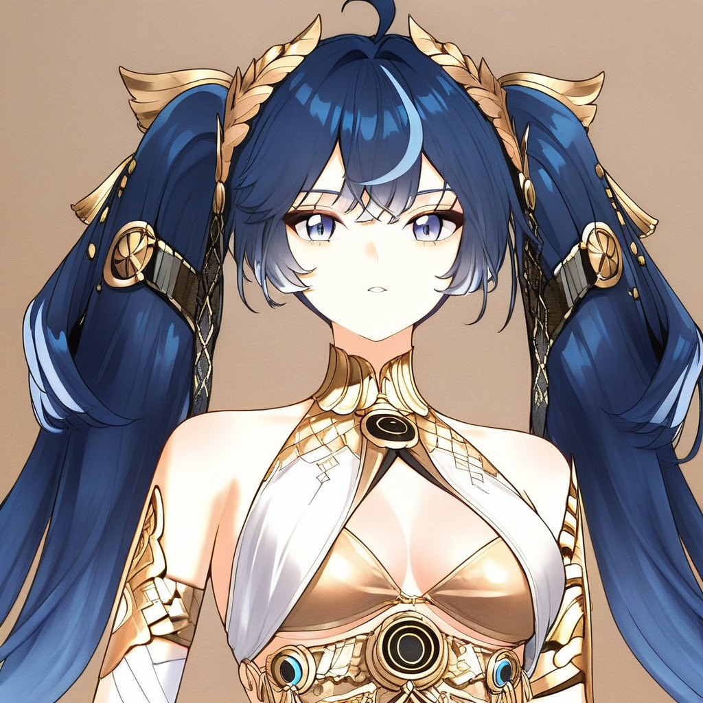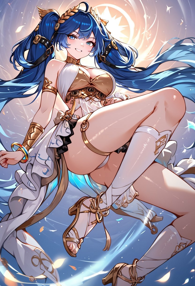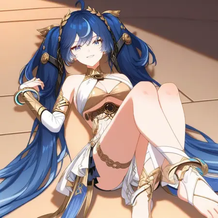 | 학습된 단어 | Base: Iuno, long blue hair, twin tails, golden hair ornaments, blue eyes, fair skin, slim body,복사됨! Outfit: white asymmetrical dress with golden details, golden belt, golden armlets, golden bracelets, blue and white ribbons, black shorts, white thigh straps, golden anklets,복사됨! |