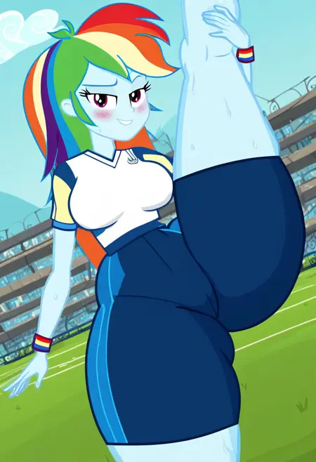 <lora:MLP: Equestria Girls - Sport Suit - Rainbow Dash :1>,运动装,白色短袖运动衫,V领配海军蓝镶边,黄色肩部装饰,海军蓝袖口,紧身海军蓝运动短裤,侧面有浅蓝色条纹,长筒海军蓝运动袜,带有浅色图案,蓝色厚底跑鞋,多彩腕带(紫色和黄色)