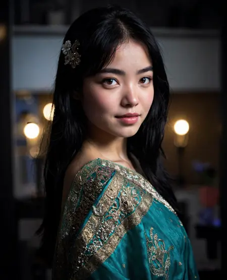 ind-g1, realistic portrait of a beautiful Indian woman, cinematic lighting, natural skin texture, detailed eyes, depth of field, ultra-realistic photography