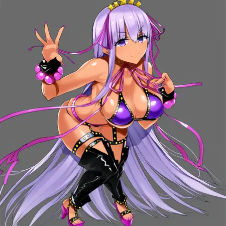 Base: BB, dark skin, purple hair, very long hair, straight hair, purple eyes, star hair accessory, large breasts,