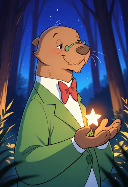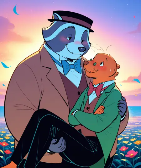 , (1boy, hawilbb, otter_boy, (old), slim_body:0.5, orange skin, mini_eyewear), ((red_detached_bowtie), high collar, green tailcoat, black pants), nervous smile, princess carry, blush,