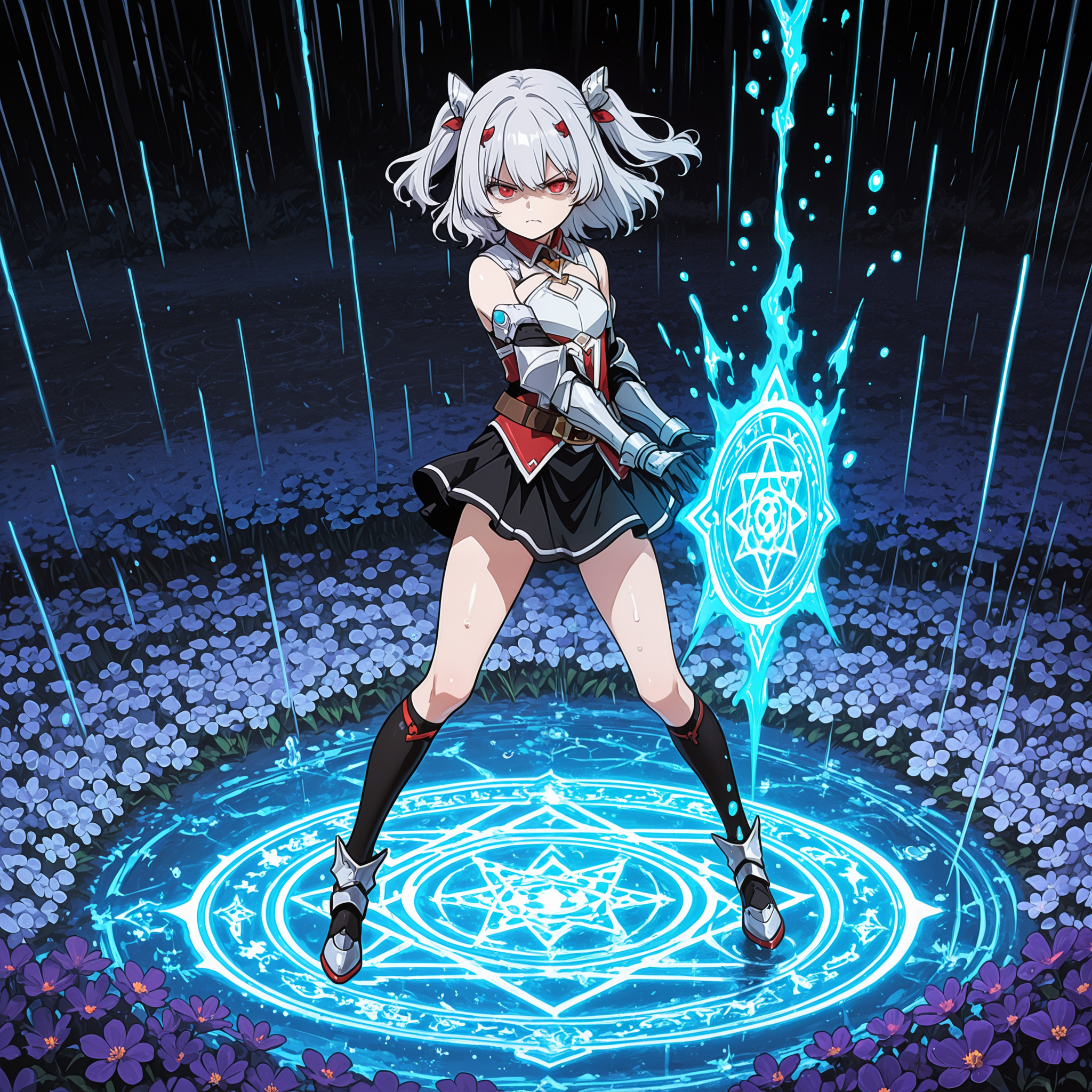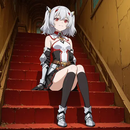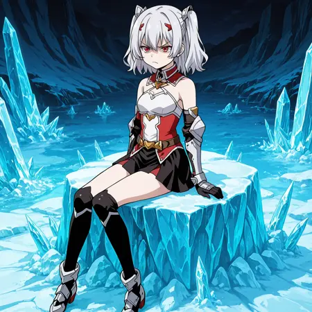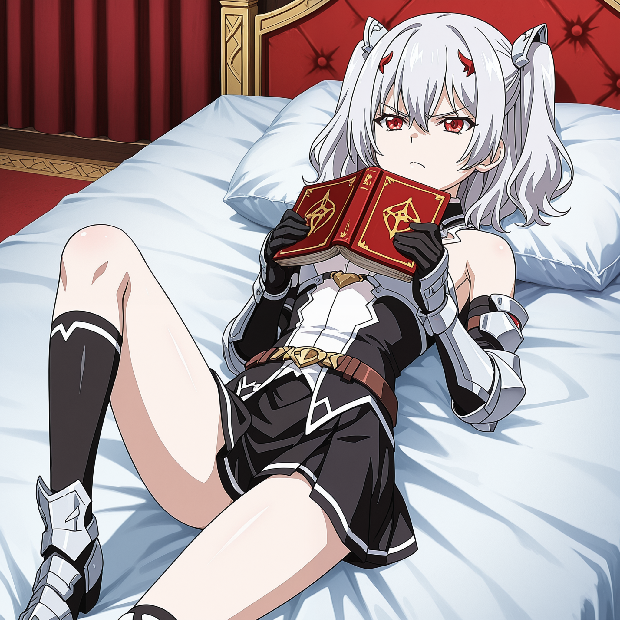 red eyes, silver hair, short twintail, hair ribbons, hair pins,