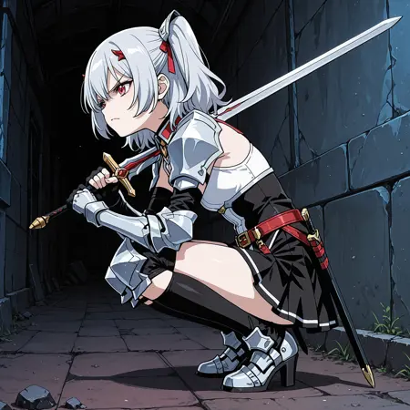 white top, minidress armor, black skirt, belt, black kneehighs, metalic shoes,