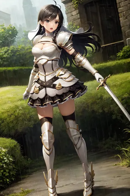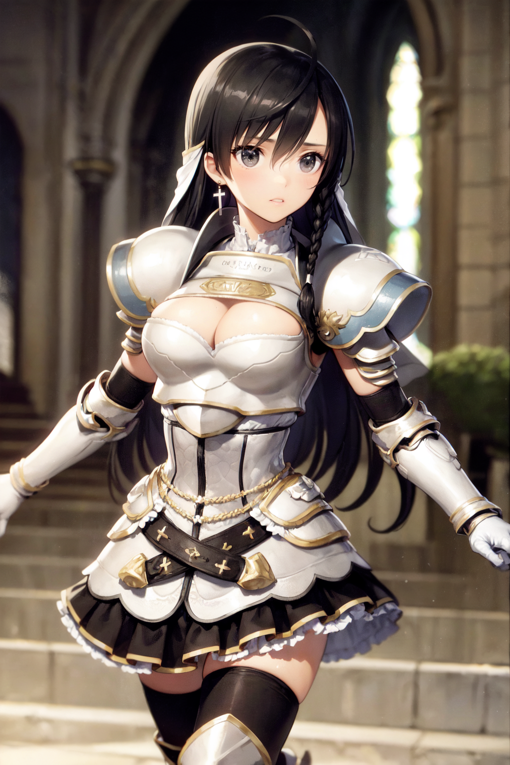添加:“十字耳环、发饰、面纱、装甲连衣裙、肩甲、胸甲、护手、腰带、裙摆、黑色过膝长筒袜、护胫、装甲靴”