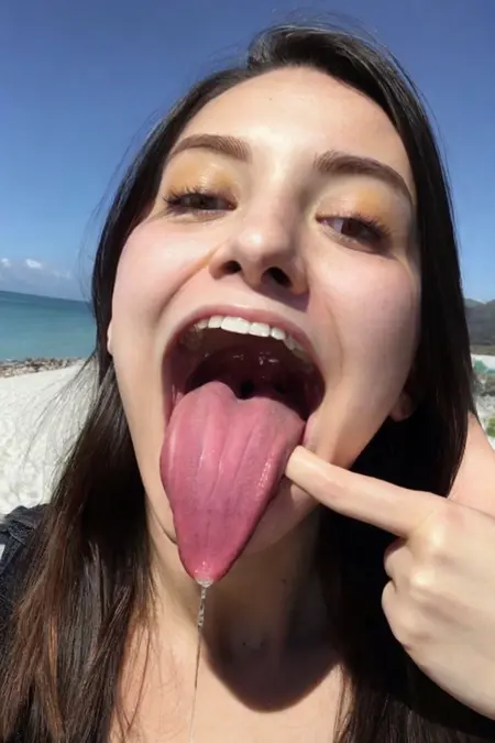 she stretches her mouth with her hand, 그녀가 한 손으로 입을 당김