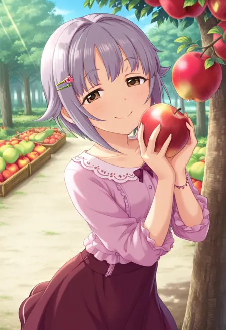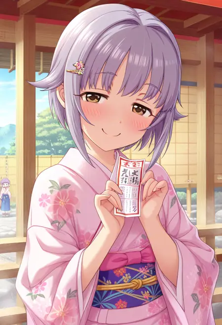 트리거 단어: 코시미즈 사치코, 단발, 보라색 머리, 갈색 눈