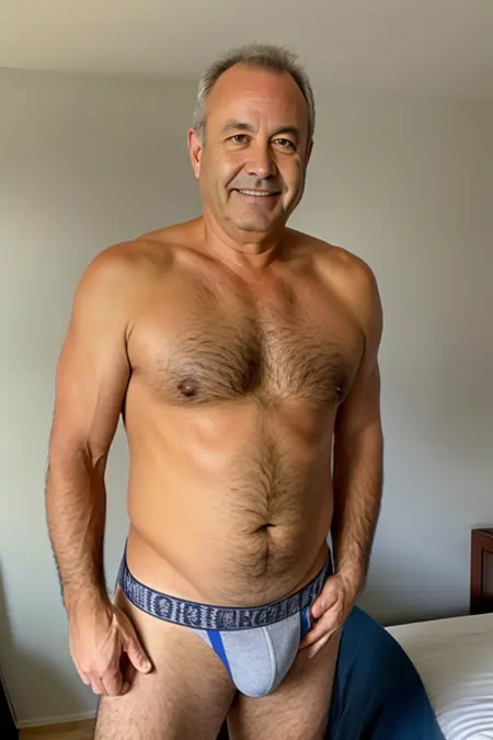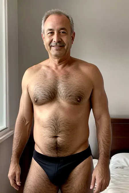 提示词:中等体型,60岁普通男子的肖像,穿着丁字裤,赤裸上身,站在卧室中,摆出模特姿势,微笑,高度细节,HDR,4K