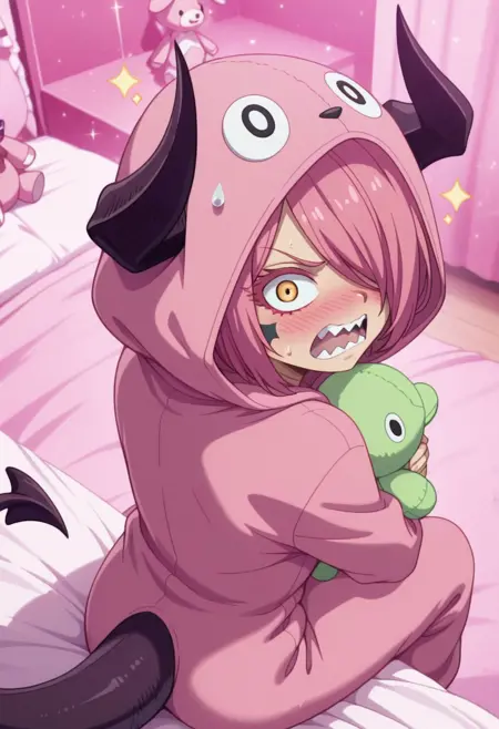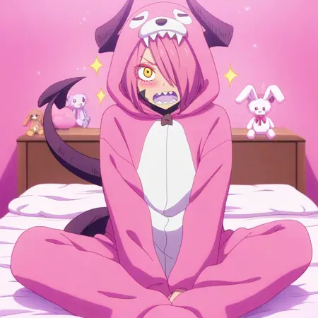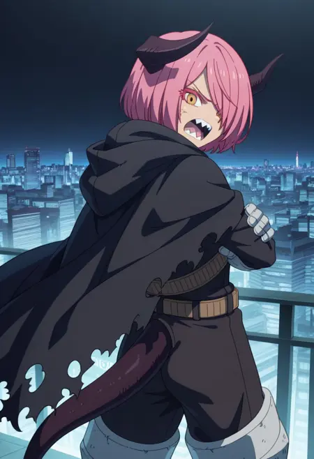 short hair, pink hair, horns, yellow eyes, slit pupils, sharp teeth, tail, armor, belt, torn cape