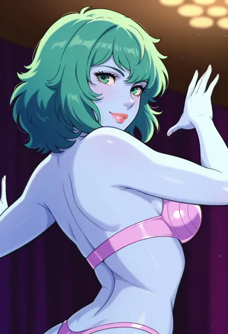 masterpiece, best quality, patriciadancer, patriciadancer outfit, loincloth, armlet, pasties, standing pose, full body, stage lights, sci-fi background, spotlight, performance, anime style, neon glow