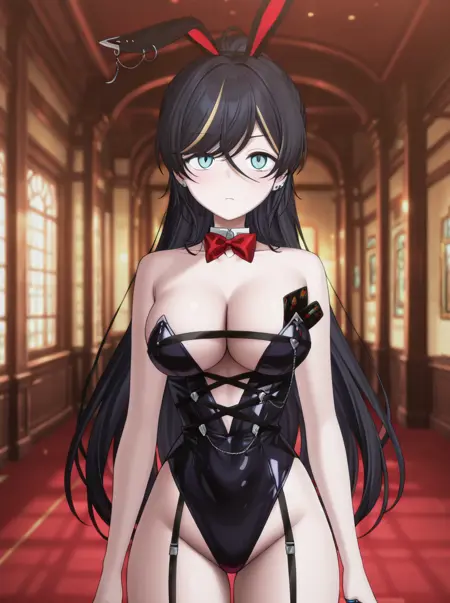 Prompts: zunbird, 1girl, breasts, bow, animal ears, rabbit ears, leotard, black hair, playboy bunny, bowtie, cleavage, bare shoulders , smile, pantyhose, poker_cards long hair,