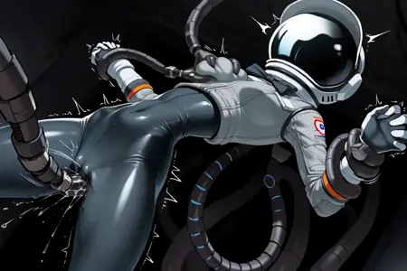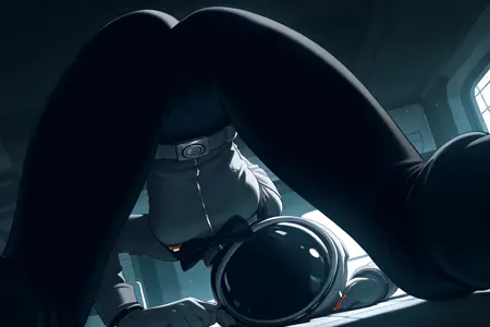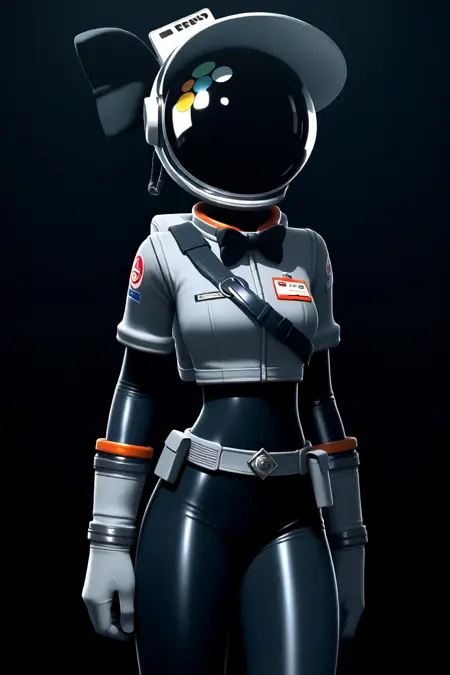 matte grey jacket, black tight pants, black tight shirt, big black bowtie on head