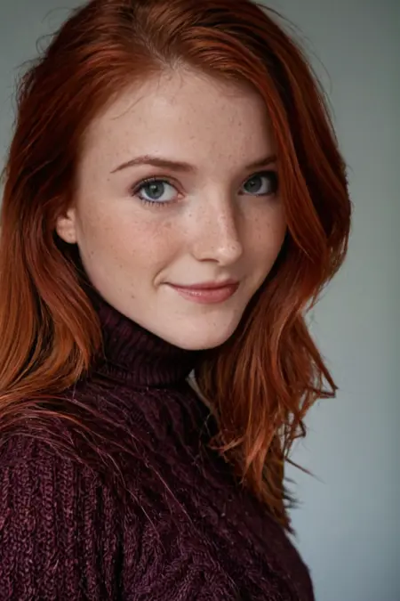"24-year-old Irish woman, fair skin with freckles long red hair, slim figure, soft jawline."