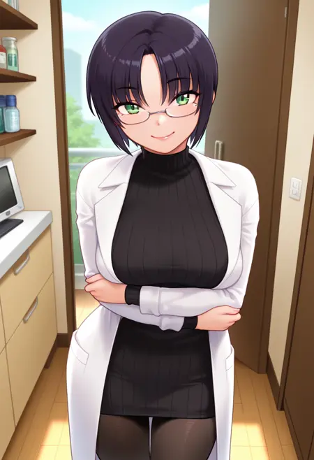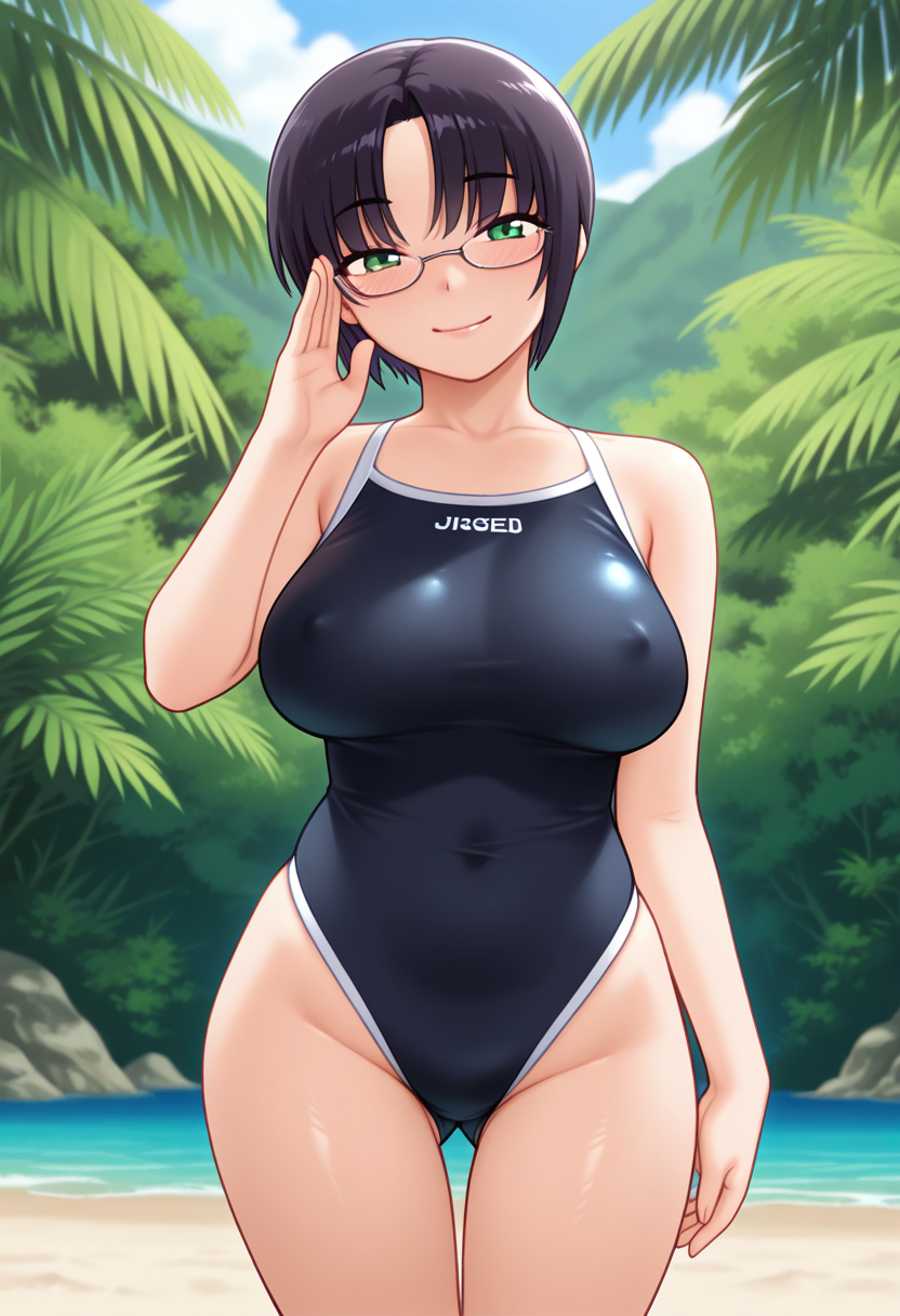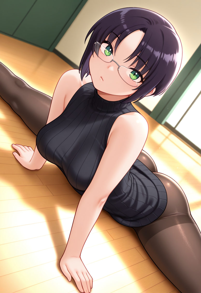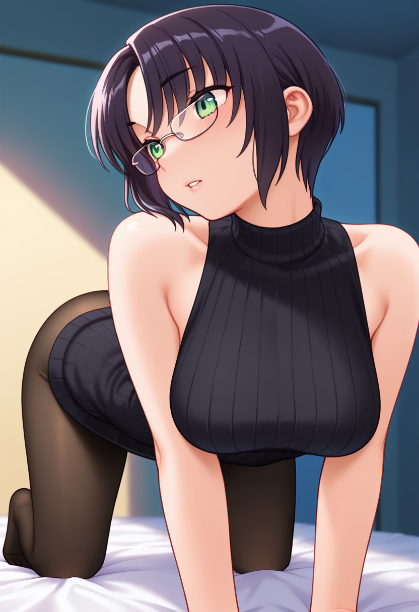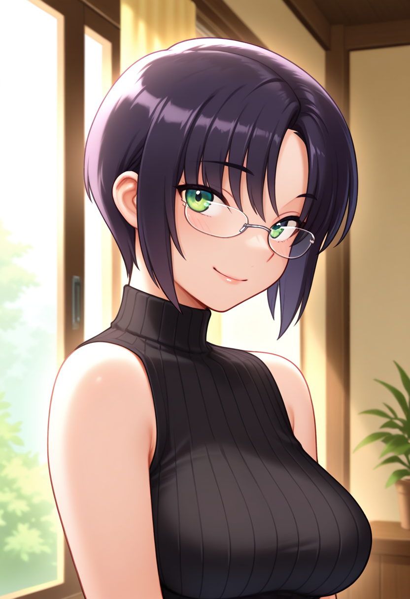 • kaedeww, 녹색 눈, 검은 머리, 단발, 중간 갈라진 앞머리, 안경, 큰 가슴,