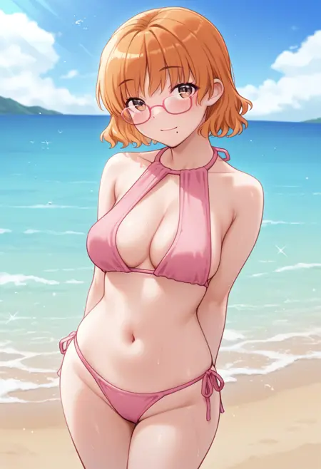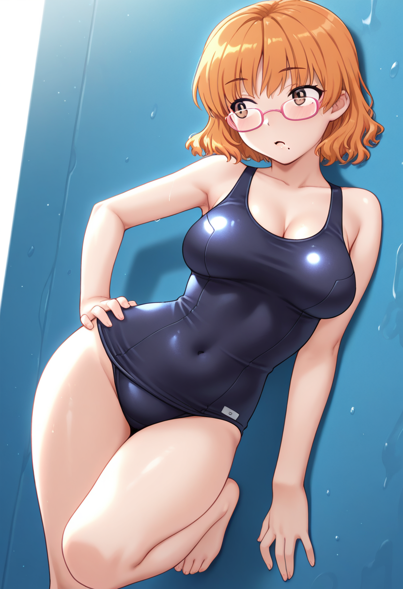 - manamiww, 갈색 눈, 오렌지색 머리, 중간 길이 머리, 파마 머리, 입 아래 점, 안경, 분홍색 테 안경, 중간 크기 가슴,