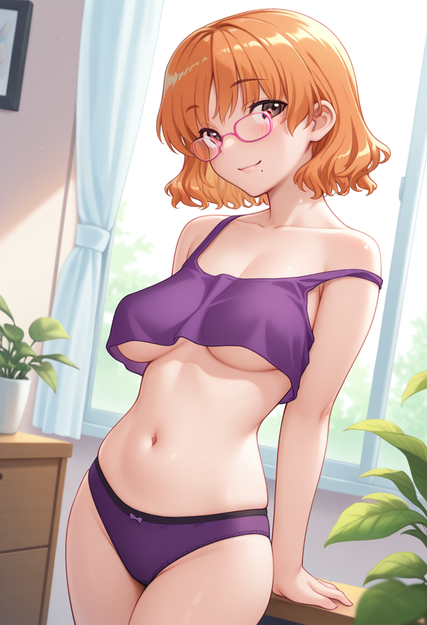 스트랩 슬립, 크롭탑, 크롭탑 오버행, 보라색 탱크톱, 브라 없음, 언더부브, 보라색 팬티,